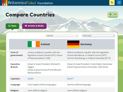 Tá uirlis iontach ag Britannica School a ligeann duit dhá thír a chur i gcomparáid lena chéile. Déan comparáid idir méid, daonra, teangacha, cineálacha rialtais agus déan iniúchadh ar ailt bhreise a scríobh foireann saineolaithe Britannica. Rochtain shaor áit ar bith in Éirinn.