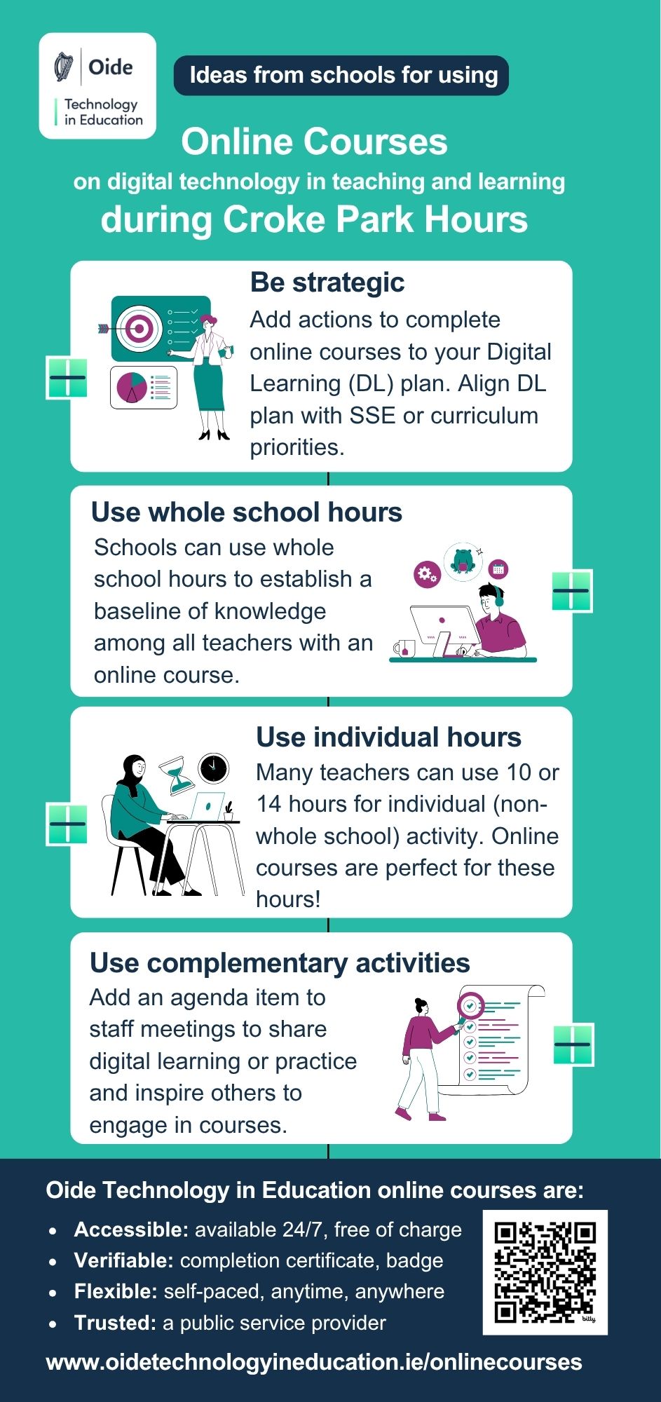 See our short presentation video, infographic and article with ideas we collected from schools on how they are using online courses for Croke Park hours.